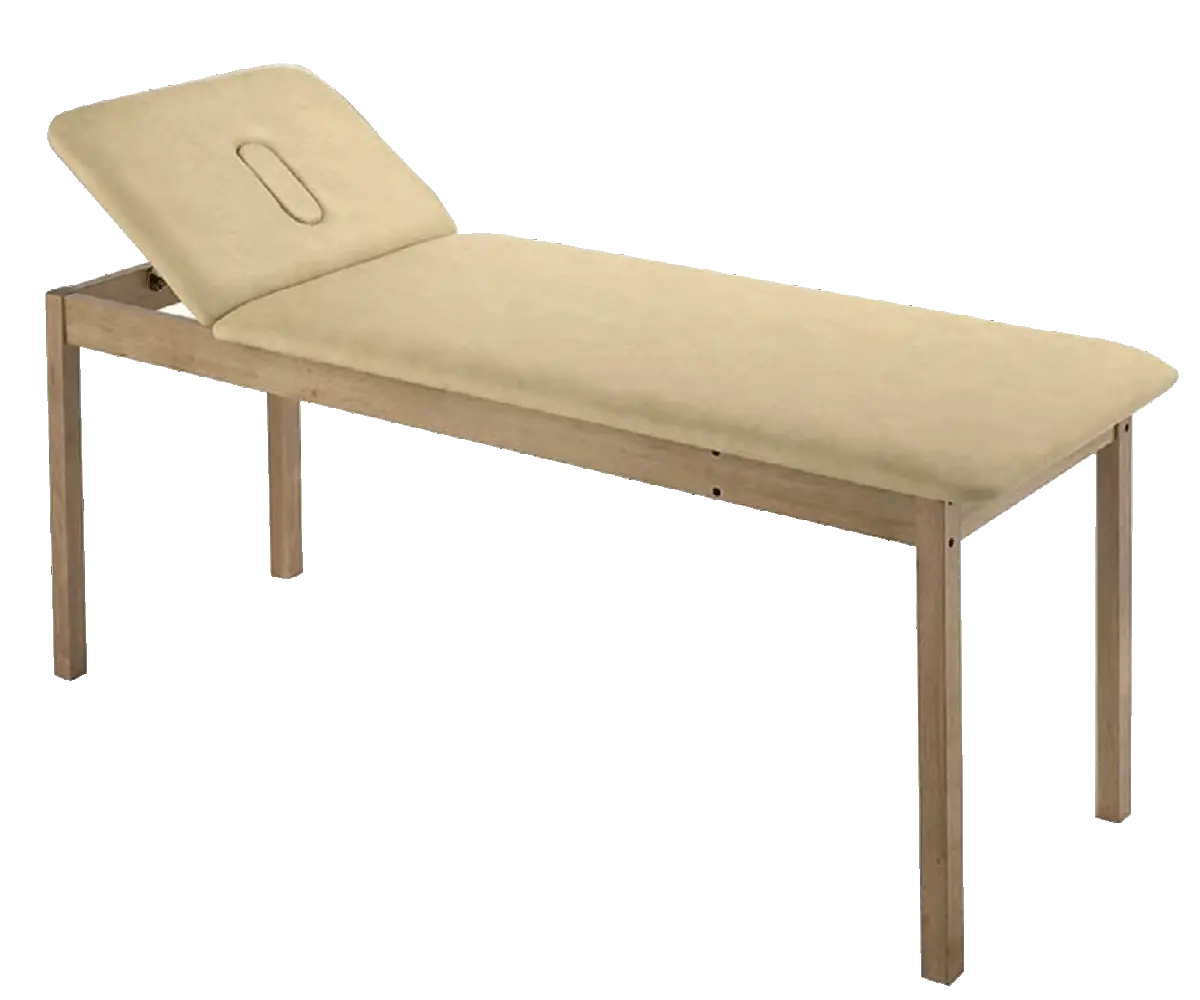 Table de massage avec une articulation et deux secteurs, hauteur fixe et structure en hêtre naturel. Cette table est conseillée également pour les visites médicales et les traitements.