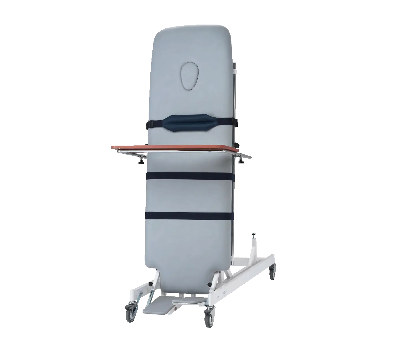 Table de verticalisation, plan unique, avec une inclinaison assistée par un moteur électrique. La hauteur fixe de 49 cm permet un transfert facile des patients vers un fauteuil roulant.