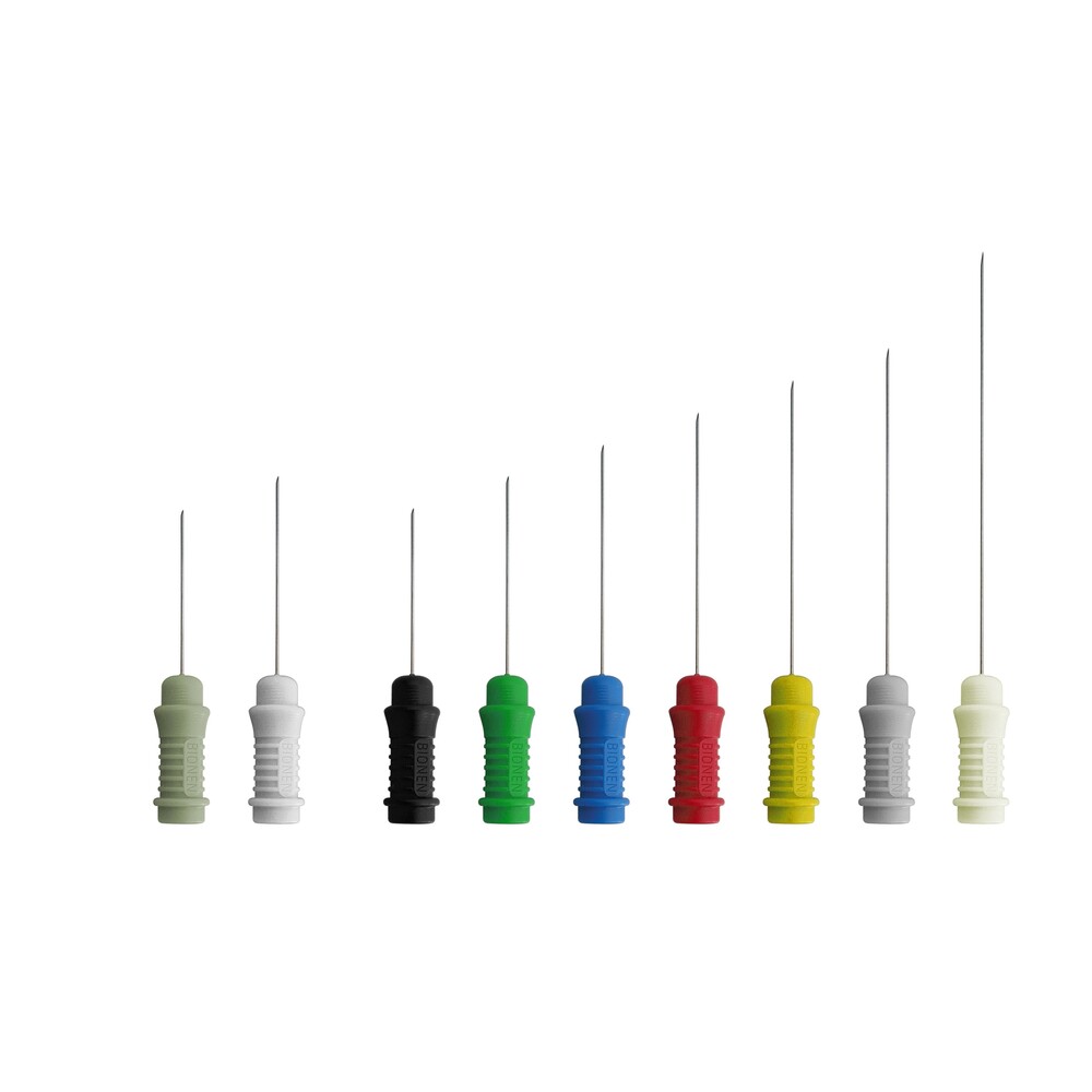 BIONEN propose des aiguilles de différents diamètres (de 0,30 mm à 0,46 mm) et longueurs (de 30 mm à 75 mm).