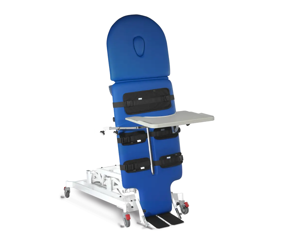 Table de verticalisation bariatrique avec une hauteur et une inclinaison assistée par deux deux moteurs électriques. La hauteur variable allant de 50 à 95cm, permet un transfert confortable du patient sur un fauteur roulant.